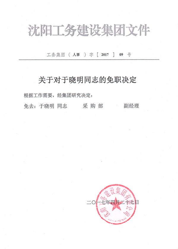工務(wù)集團(tuán)(人事)字【2017】09號(hào)《關(guān)于對(duì)于曉明同志的免職決定》