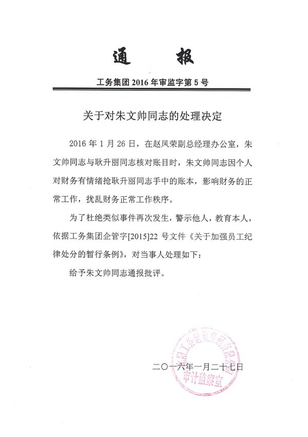 工務集團2016年審監(jiān)字第5號《關于對朱文帥同志的處理決定》