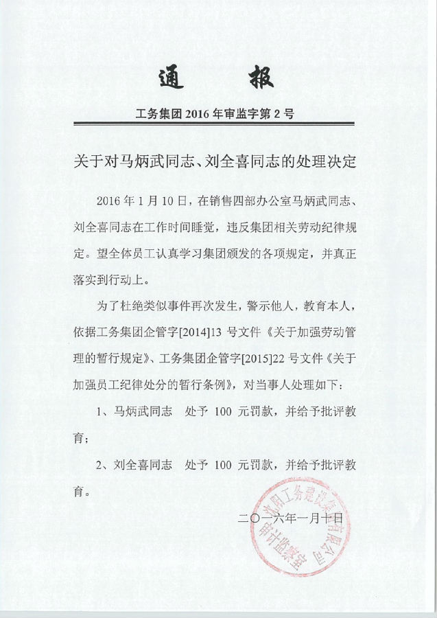 上一篇:工務(wù)集團(tuán)2016年審監(jiān)字第5號(hào)《關(guān)于對(duì)朱文帥同志的處理決定》...