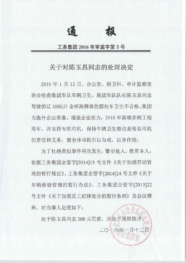 上一篇:工務(wù)集團(tuán)2016年審監(jiān)字第5號(hào)《關(guān)于對(duì)朱文帥同志的處理決定》...