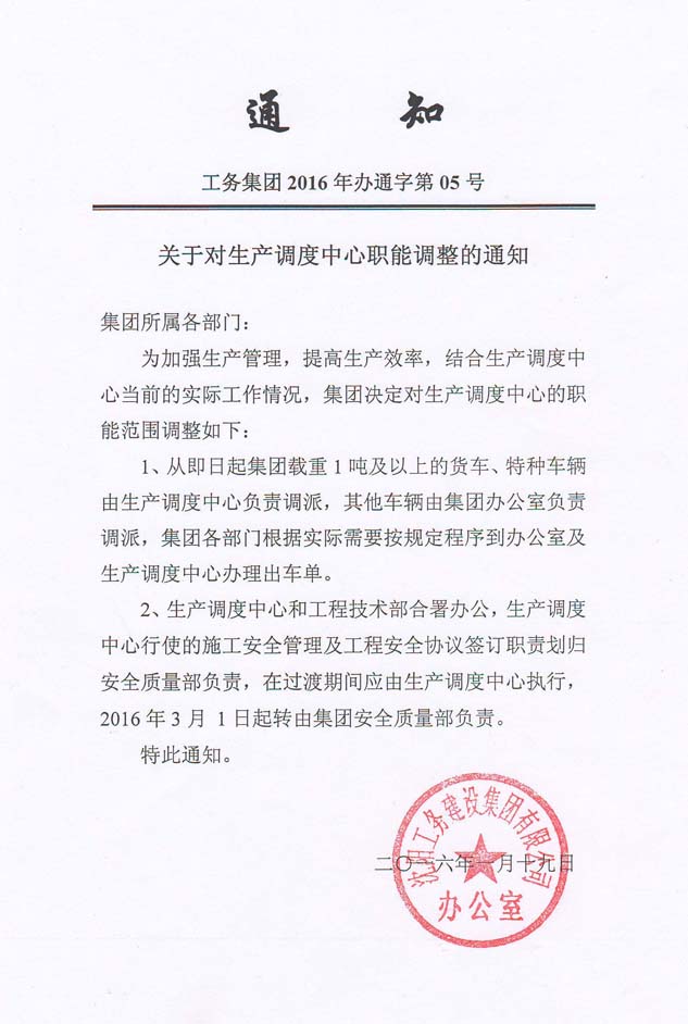 工務集團2016年辦通字第05號《關于對生產(chǎn)調(diào)度中心職能調(diào)整的通知》